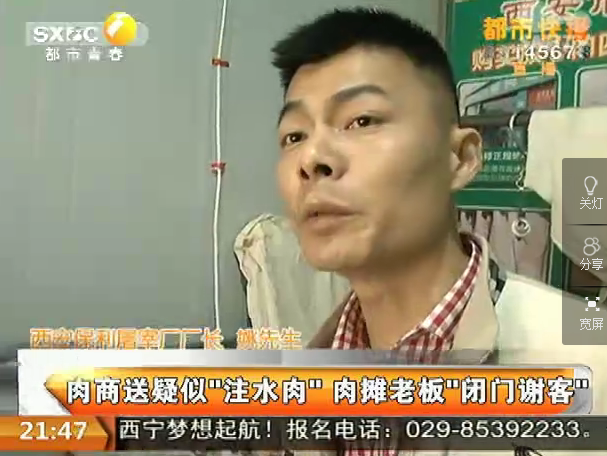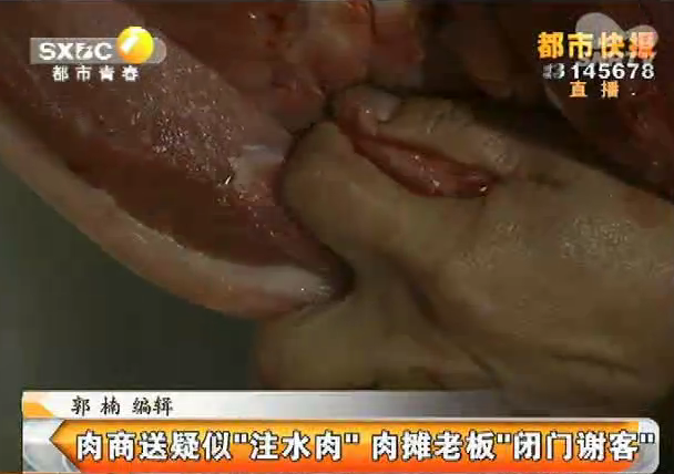 肉商送疑似“注水肉” 肉攤老板“閉門謝客”陜西都市青春頻道報道,轄區(qū)內肉商肉商送疑似“注水肉” 肉攤老板“閉門謝客”