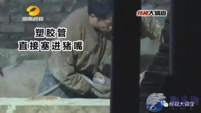 這里竟然是一個(gè)隱藏的灌豬增重的現(xiàn)場(chǎng),這里一共有三名工人,一人負(fù)責(zé)拿管子往住嘴里塞,一人負(fù)責(zé)打開(kāi)灌注的開(kāi)關(guān),另一人負(fù)責(zé)趕豬。
